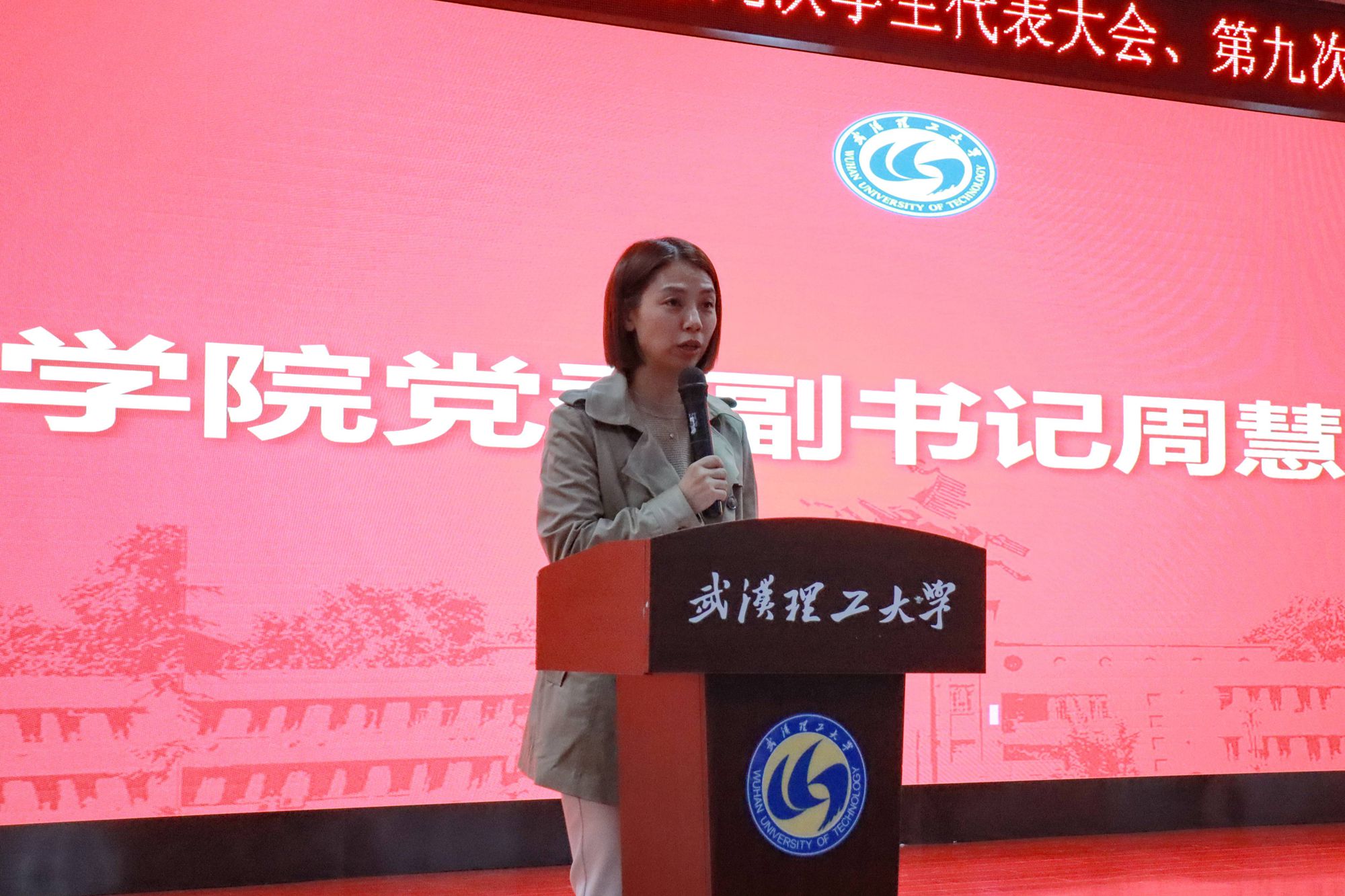 在庄重整齐的国歌声中,大会正式开始。学院党委副书记周慧致辞,周书记代表学院党委对本次大会的顺利召开表示热烈祝贺,对一年来积极服务学院师生,促进学院建设发展的各级学生组织及全体学生干部表示衷心感谢。同时,周书记也向青年学生们提出了希望和要求:要树立远大志向,坚定理想信念;要提升道德修养,培养高尚品格;要珍惜学习时间,练就过硬本领;要秉持艰苦奋斗,勇担时代大任。