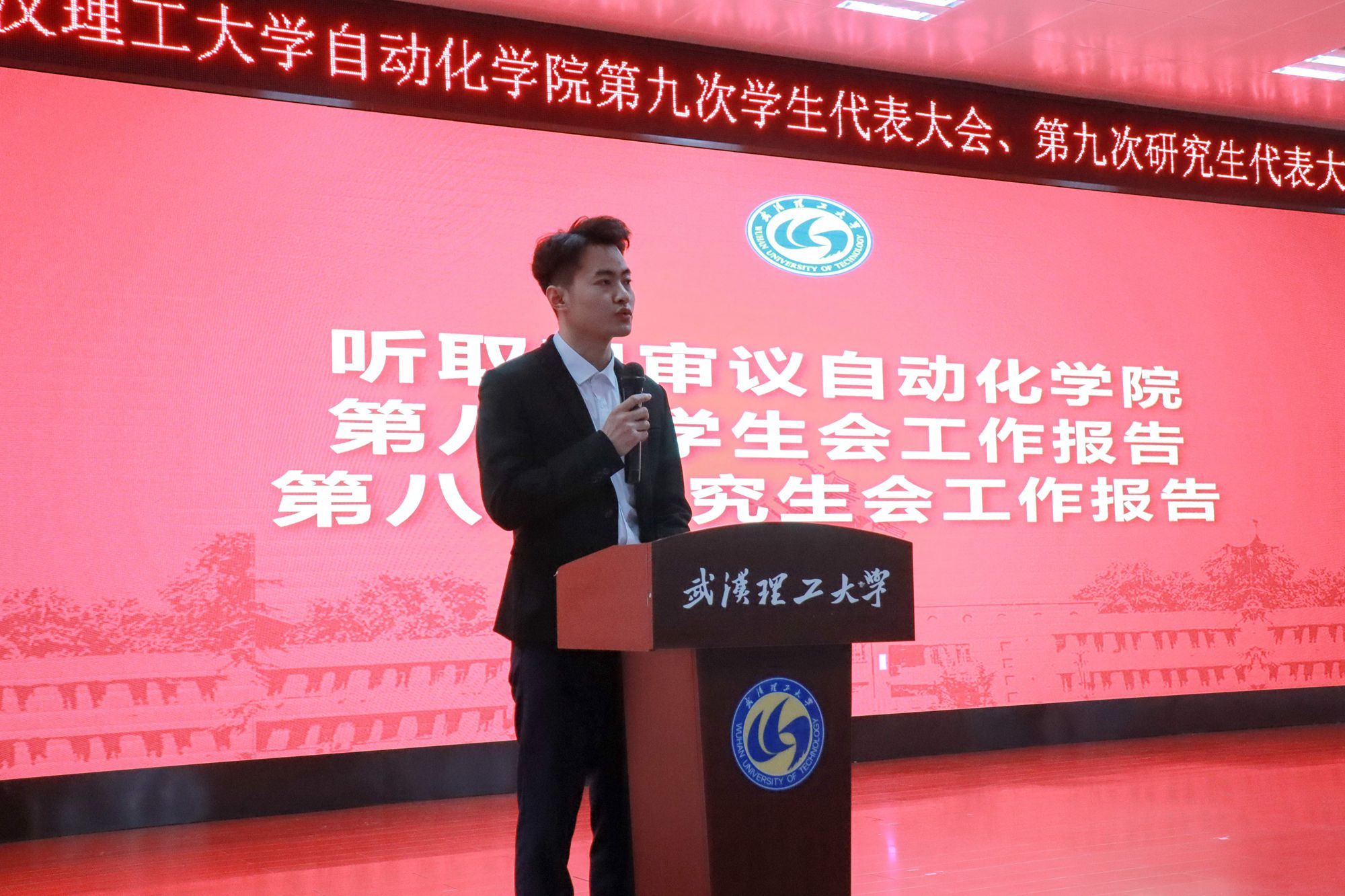 随后,代鑫同学代表学院第八届学生会和研究生会向大会作工作报告。他在报告中提到,自第八次学生代表大会以来,学院学生会组织围绕“全心全意为同学服务”的宗旨,不断加强思想引领、深化组织改革、完善权益服务、营造学风氛围、精心组织文体活动,并取得了优异成绩。今后学院学生会组织将持续深化改革,发挥好连接学生和学校学院的桥梁纽带作用,为学校、学院的发展建设贡献青春力量。