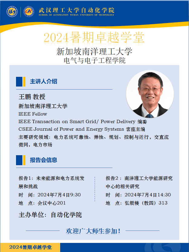 【det365登录网站主页暑期卓越学堂】报告1:未来能源和电力系统发展和挑战;报告2:南洋理工大学能源研究中心的相关研究